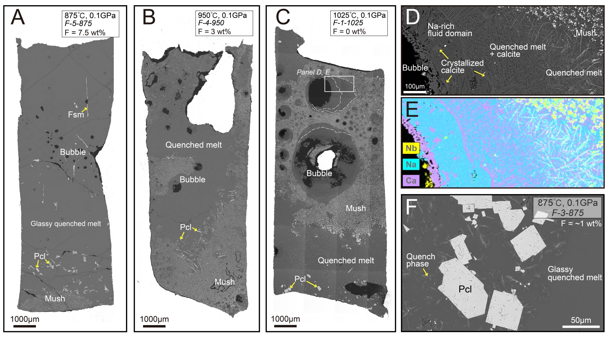 图1 实验产物的特征分析。(A−C)整个样品胶囊的背散射电子图像,展示了不同温度和氟含量条件下的实验产物形貌;(D)1025 ℃实验产物的放大图像,呈现了淬火熔体及气泡周围的富钠流体区域结构;(E)图D对应区域的能谱面扫描元素分布图,展示了成分分布特征;(F)背散射电子图像中显示的结晶烧绿石(淬火相:淬火过程中形成的微细烧绿石晶体)