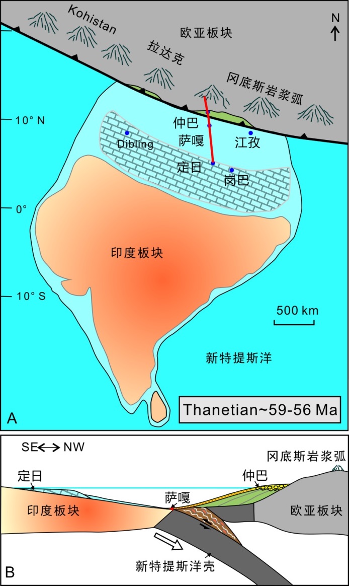图1 印度-亚洲初始碰撞时古地理示意图(A:平面;B:剖面)