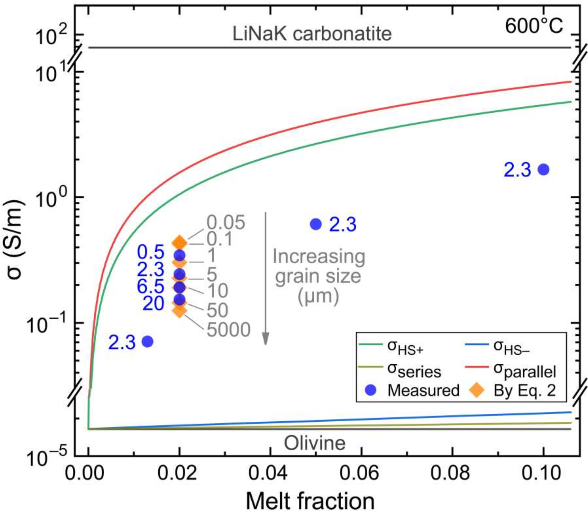 橄榄石-熔体体系中熔体电导率随熔体含量和体系拓扑结构变化管系图。蓝色点为实验测定值,橘黄色点为计算值,数字表示橄榄石颗粒粒度(单位微米)。可以发现,实际电导率远低于模型计算结果(红色和绿色线条)
