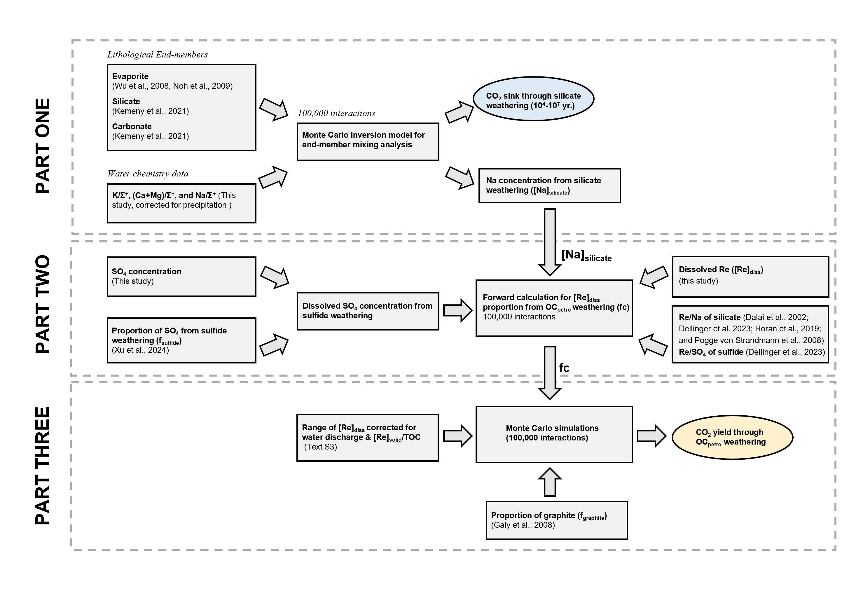 为此,永利官网陈骏院士和陈旸副教授课题组在流经青藏高原东缘及东南缘的长江、黄河、澜沧江、怒江及雅鲁藏布江等大河上游开展了一系列深入研究。通过分析河水及河床沉积物的主量元素组成、铼浓度、有机碳含量等指标,并结合蒙特卡罗模拟计算(图1),研究团队成功量化了研究区内的OCpetro风化通量。基于通天河的量化结果,估算出青藏高原当前的OCpetro风化通量为1.95 (±0.60)tC·km-2·yr-1,在104-107年时间尺度上的地质碳收支为1.81 +0.34/-0.49 tC·km-2·yr-1。这一结果暗示,青藏高原目前很可能是一个地质碳源(图2)。本研究拓展了当前对造山带岩石有机碳风化过程的认知,并揭示了造山带在不同阶段可能发生从碳汇向碳源转变的特征。该研究成果为深入理解青藏高原的地质碳循环提供了重要的科学依据,也为全球碳循环模型的完善提供了新的数据支撑。