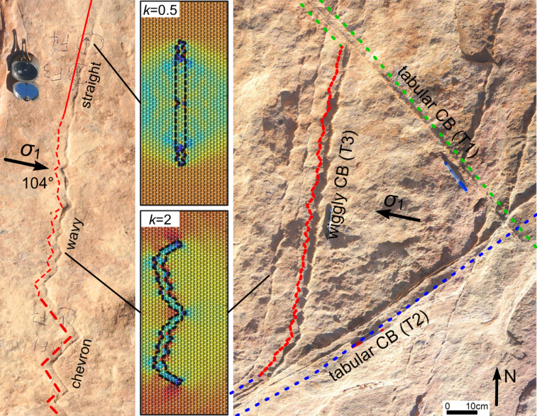 这两篇论文主要基于自主研发的两个软件系统,颗粒(孔隙)及裂隙图像识别与分析系统(PCAS),以及三维离散元数值模拟软件MatDEM。第一篇论文采用PCAS软件定量地分析了不同形态的压密带原岩孔隙和颗粒系统结构,发现当压密带由V型向波浪型和平直型转变时(如图),其原岩的孔隙度和分选等级呈增加的趋势。据此推断砂岩孔隙度和分选等级的增加引起岩石力学性质的变化,使得砂岩破坏角增加,并形成不同形态的压密带。第二篇论文采用改进的离散元工程数值法和MatDEM软件(Liu et al., JGR, 2013)来模拟砂岩的破坏过程。模拟结果表明:砂岩模型破坏角,压密带形态与砂岩的屈服包络面形状紧密相关,并受砂岩的屈服应力、抗压强度等因素影响。两篇论文结果相互印证,揭示了砂岩压密带的形态受砂岩的微观结构和力学性质作用。该成果将进一步应用于地面沉降、页岩气水力压裂和滑坡演化等的定量分析和数值模拟研究。