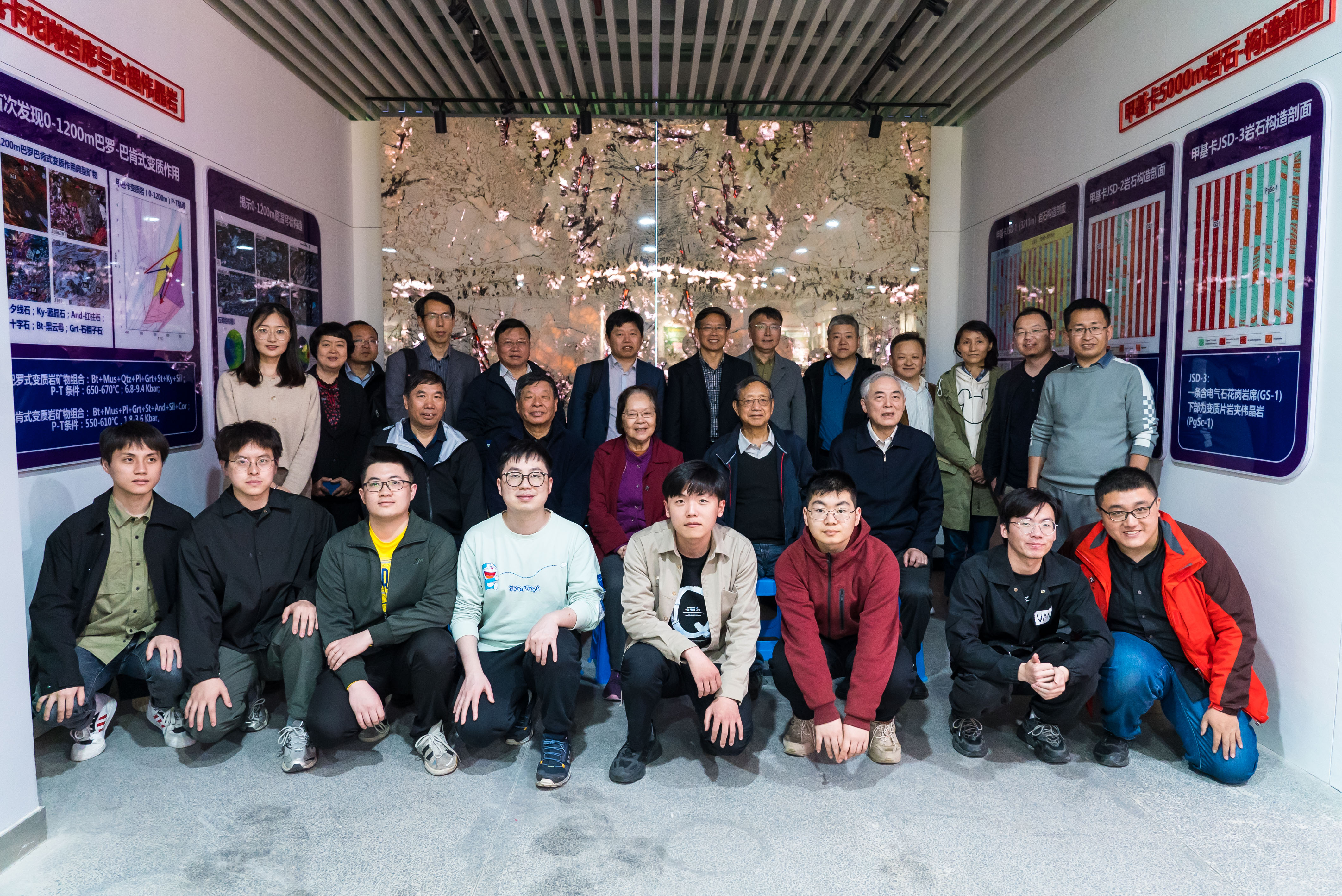 最后,在场全体师生在“镇馆之宝”——伟晶岩岩板前一同合影留念。