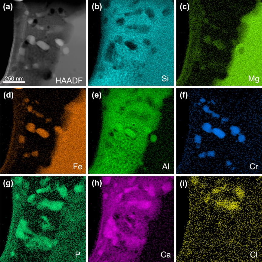 图1、富磷橄榄石的透射电子显微镜观察及X射线扫描结果