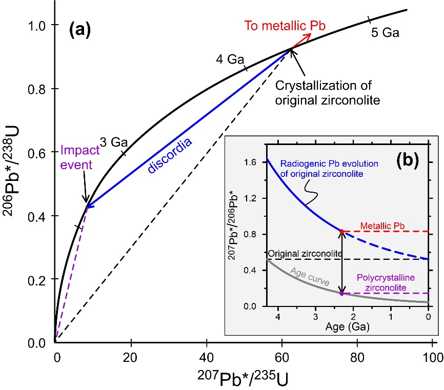 图5、金属铅的形成对钙钛锆石U-Pb同位素体系和年龄的影响