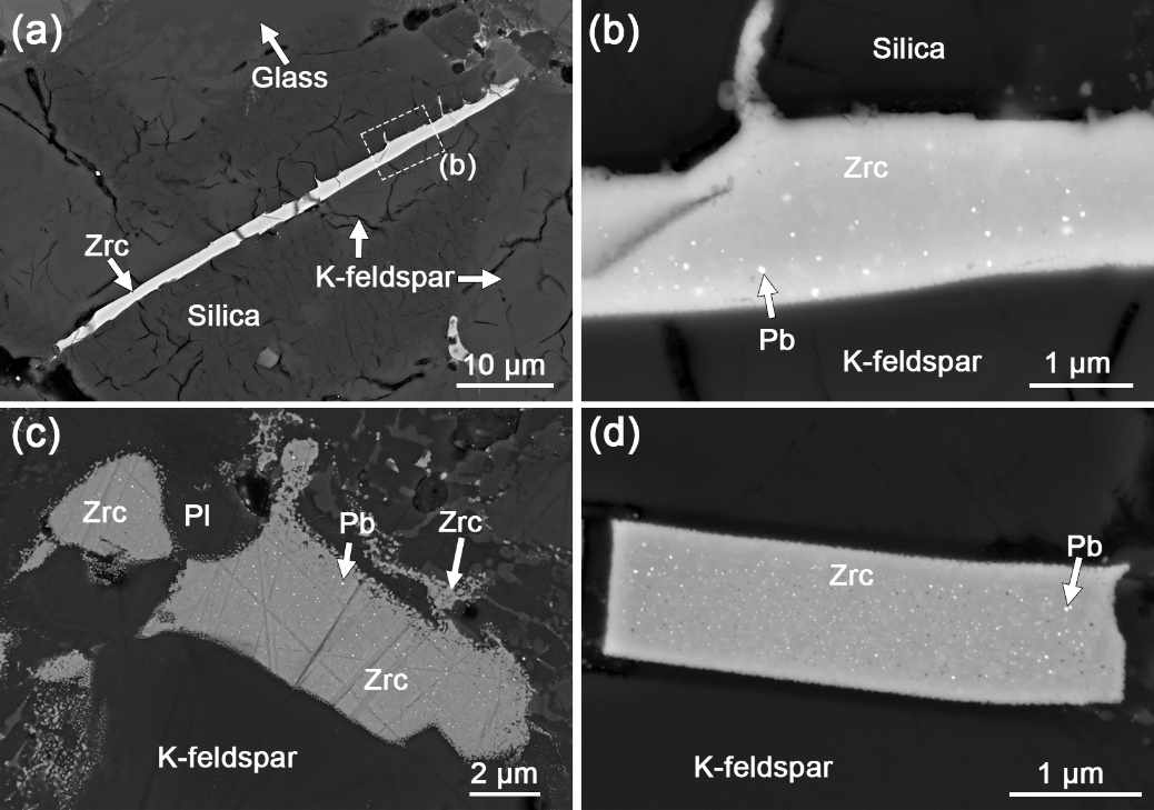 图3、扫描电子显微镜拍摄的月球陨石NWA 8182中的钙钛锆石(Zrc)及其中的金属铅小亮点(Pb)