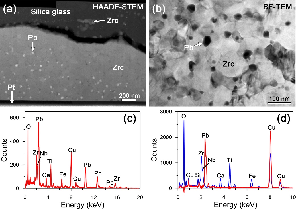 图4、透射电子显微镜拍摄的钙钛锆石(Zrc)多晶集合体和金属铅颗粒(Pb)
