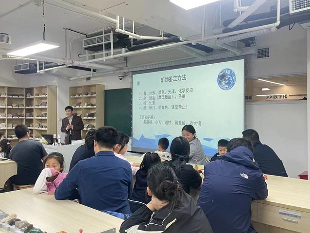 随后,大家步行至蒙民伟楼地球科学国家级实验教学示范中心鼓楼校区分中心。这里不仅是地质学相关专业学生的实验课堂,更是科普教育的重要基地。解国爱教授向大家介绍常见的几种矿物、岩石及其鉴定方法,并鼓励大家动手实验,课堂氛围积极、活跃且富有启发性,小朋友们通过实验都正确的区分出来了10种矿物、岩石,对地球科学产生了浓厚的兴趣。