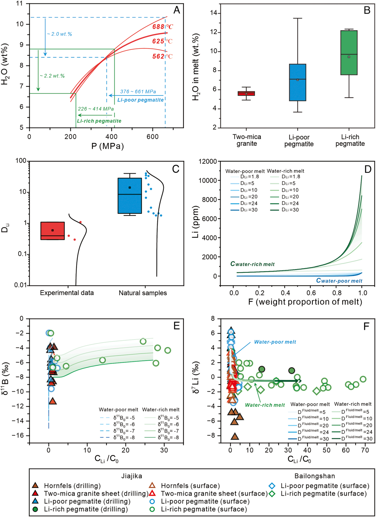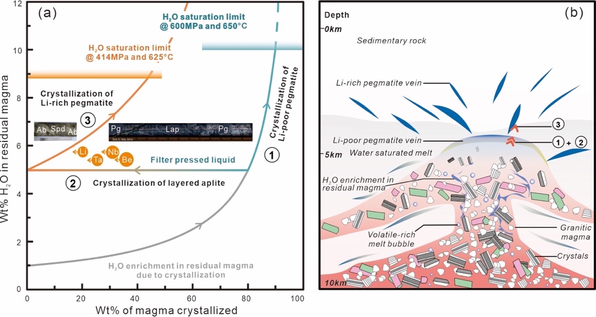 图4. 甲基卡伟晶岩锂矿区贫锂伟晶岩和富锂伟晶岩形成机制。