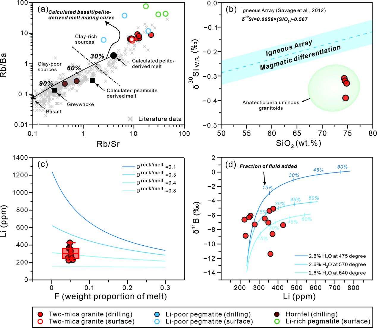 在基墨里造山作用早期(~221 Ma)地壳缩短和加厚阶段,沉积盖层经历了大规模强烈褶皱和逆冲,盖层与基底之间发育上盘向南的滑脱断层,伴随巴罗式变质作用。根据巴罗式变质作用P-T轨迹,相平衡模拟表明进变质作用过程脱出2.5 wt.% H2O,质量平衡模型和批式熔融模型模拟估算出小体积源岩(约5%)发生部分熔融,初始熔体中10–30%的锂来自变质流体。花岗岩全岩地球化学指标(Rb/Sr vs. Rb/Ba和30Si–SiO2)一致指示了甲基卡花岗伟晶岩母熔体来自泥质岩部分熔融。变质深熔产生的初始岩浆中锂含量较上地壳平均值(38 ppm)富集3-8(图2)。