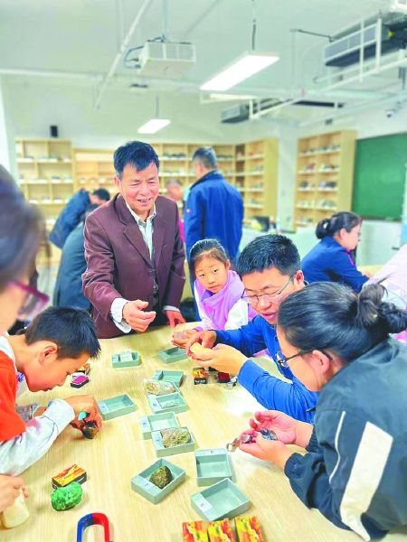 随后,15组家庭来到蒙民伟楼地球科学国家级实验教学示范中心鼓楼校区分中心。该中心副主任解国爱教授介绍了常见几种矿物、岩石及其鉴定方法,并鼓励大家动手实验。15名小朋友分成3组,团队合作,利用现场所学知识正确地区分出了10种矿物、岩石。这一环节不仅丰富了孩子们的知识,还锻炼了孩子们的动手能力,增进了亲子间的感情。