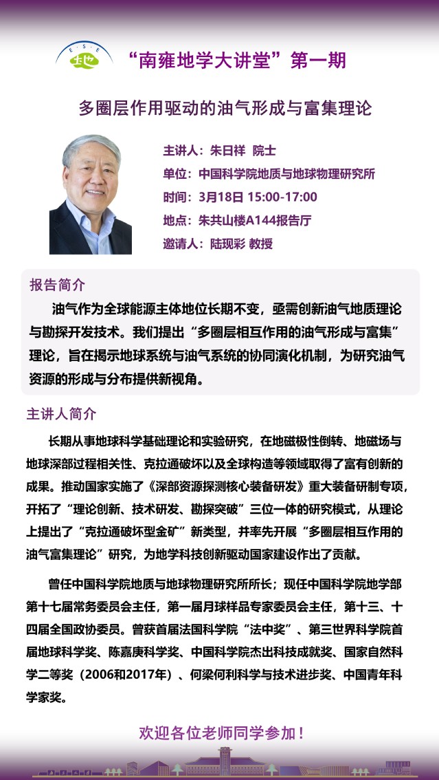 “南雍地学大讲堂”第一期——多圈层作用驱动的油气形成与富集理论