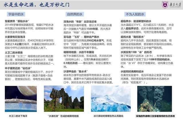 2025年3月22日是第三十三届“世界水日”,3月22日-28日是第三十八届“中国水周”。为深入学习贯彻习近平生态文明思想、习近平法治思想和习近平总书记关于治水重要论述精神,扎实推动水利高质量发展,保障国家水安全,南大地科院水科学系师生制作展出《探索水的奥秘、服务国家水安全需求》科普展板。水是生命之源,也是万妙之门。水文学是与国计民生息息相关的学科。国家对水资源的需求日益增长,水资源供需矛盾不断加剧,践行“节水优先、空间均衡、系统治理、两手发力”的治水思路,通过节水技术与管理实现水资源可持续使用。展览在鼓楼校区南园橱窗展出,欢迎大家前往观看,与我们一起探索水的奥秘。