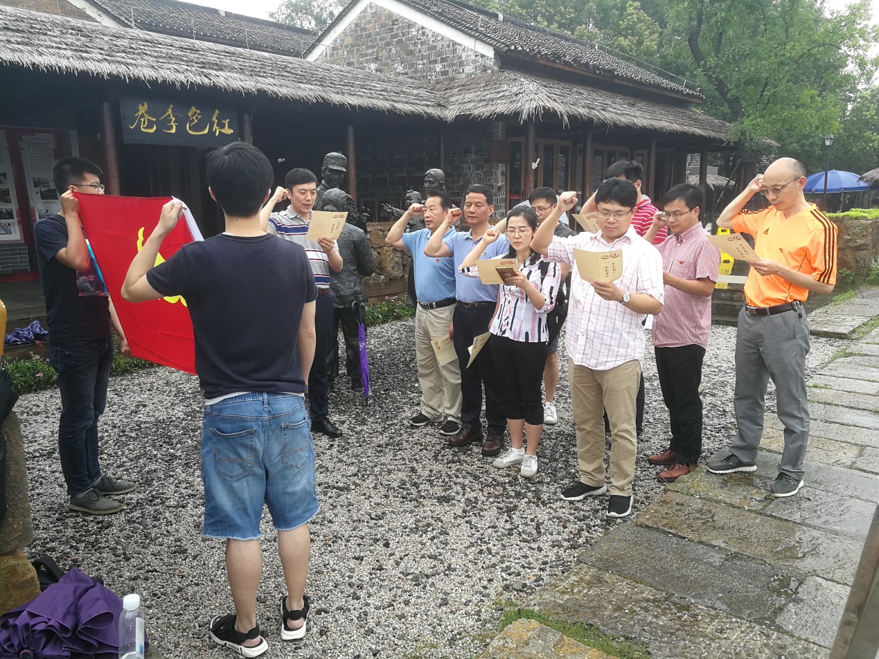 参观结束后,全体党员面对党旗,庄严地举起右手,重温了入党誓词。大家深切地感受到中国革命斗争的艰苦,更体会到无数的革命先驱铸就了中国共产党的光荣和伟大。这些事迹激励广大党员牢记使命,传承奋斗精神,恪尽职守。在实现中华民族伟大复兴的中国梦的征程中,在实现“第一个南大”的路途中,我们会继续弘扬优秀的革命传统,在各自的岗位上贡献出自己的力量!