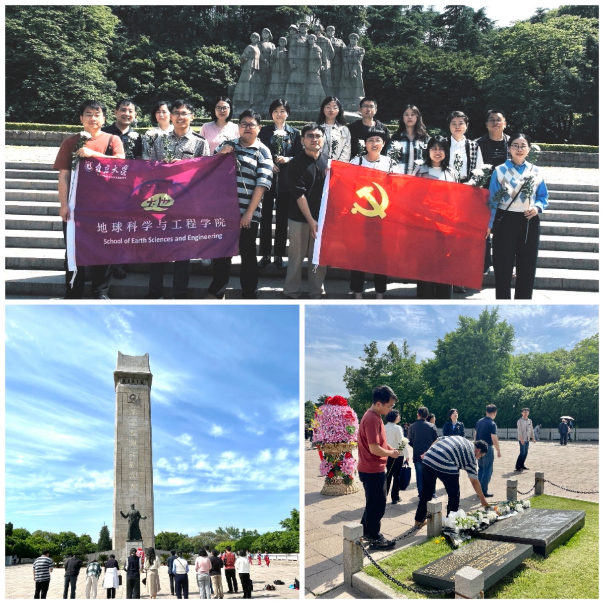 支部党员们怀着肃穆和崇敬的心情来到雨花台烈士纪念碑,向在中国人民解放事业中为了实现共产主义理想,为了国家独立、民族解放和民主自由,英勇斗争壮烈牺牲在南京雨花台的烈士们敬献了鲜花,深切缅怀先烈,继承和发扬革命斗争精神。纪念碑高42.3米,为了纪念南京1949年4月23日解放;碑额似红旗如火炬,碑身镌刻邓小平手书的“雨花台烈士纪念碑”八个镏金大字,背面有江苏省和南京市人民政府敬立的碑文。碑座前青铜雕塑,高5.5米、重约5吨多,反映共产党人、爱国志士“宁死不屈”的主题。