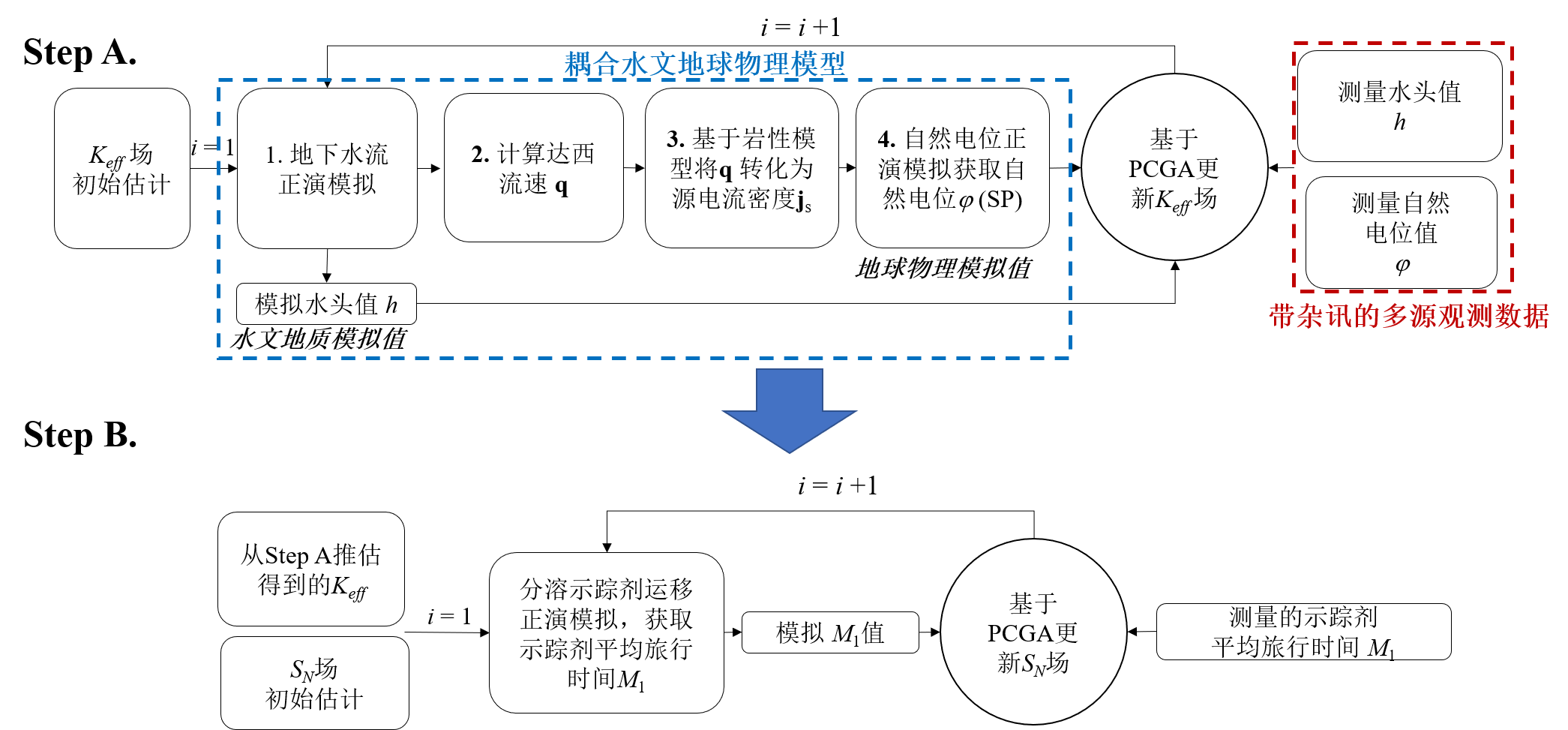 为解决上述问题,永利官网吴吉春教授和施小清教授课题组与美国斯坦福大学Peter K. Kitanidis教授合作,构建了一套精细刻画DNAPL污染源区结构的多源数据同化框架。该框架的先进性表现在两方面:1)融合大量廉价且低精度的水文地球物理数据(如self-potential自然电位,SP)与少量高精度的钻孔观测数据(如压力水头,示踪剂浓度),从而以较低的观测成本实现DNAPL场址的高精度刻画。自然电位法是一种无损物探方法,通过布设于地表的电极来监测地下流体造成的电性差异,基于此电性差异可间接获知地下流体的动态与含水层非均质空间结构。由于自然电位法无需布设钻孔,仅通过地表电极便可实现监测,其观测成本大大低于钻孔调查。但限于信号干扰和岩性物理关系,自然电位数据的测量精度通常较低。基于数据融合思路,本次研究联合了大量廉价-低精度的自然电位数据与少量昂贵-高精度的水力层析数据(压力水头),可以较低的成本获得高精度的渗透系数空间分布。基于此高精度渗透系数估计结果,进一步融合分溶示踪剂数据(partitioning tracer),从而实现DNAPL场址的高精度刻画。2)采用主成分地质统计反演方法(Principal Component Geostatistical Approach, PCGA),对协方差矩阵进行低秩估计,从而大大缓解了高维参数反演问题的计算负担。该多源数据同化框架的流程图参见图1。
