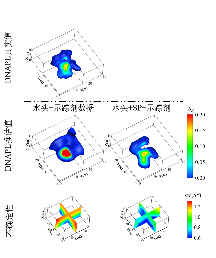 上述研究成果以“Improved characterization of DNAPL source zones via sequential hydrogeophysical inversion of hydraulic-head, self-potential and partitioning-tracer data”2020年7月发表于水文学顶级期刊《Water Resources Research》,博士研究生康学远为第一作者,施小清教授和吴吉春教授为共同通讯作者,永利304官网唯一为第一署名单位。本研究获得了国家重点研发计划(2018YFC0406402),国家自然科学基金(41730856,41672229)和国家留学基金委的联合资助。