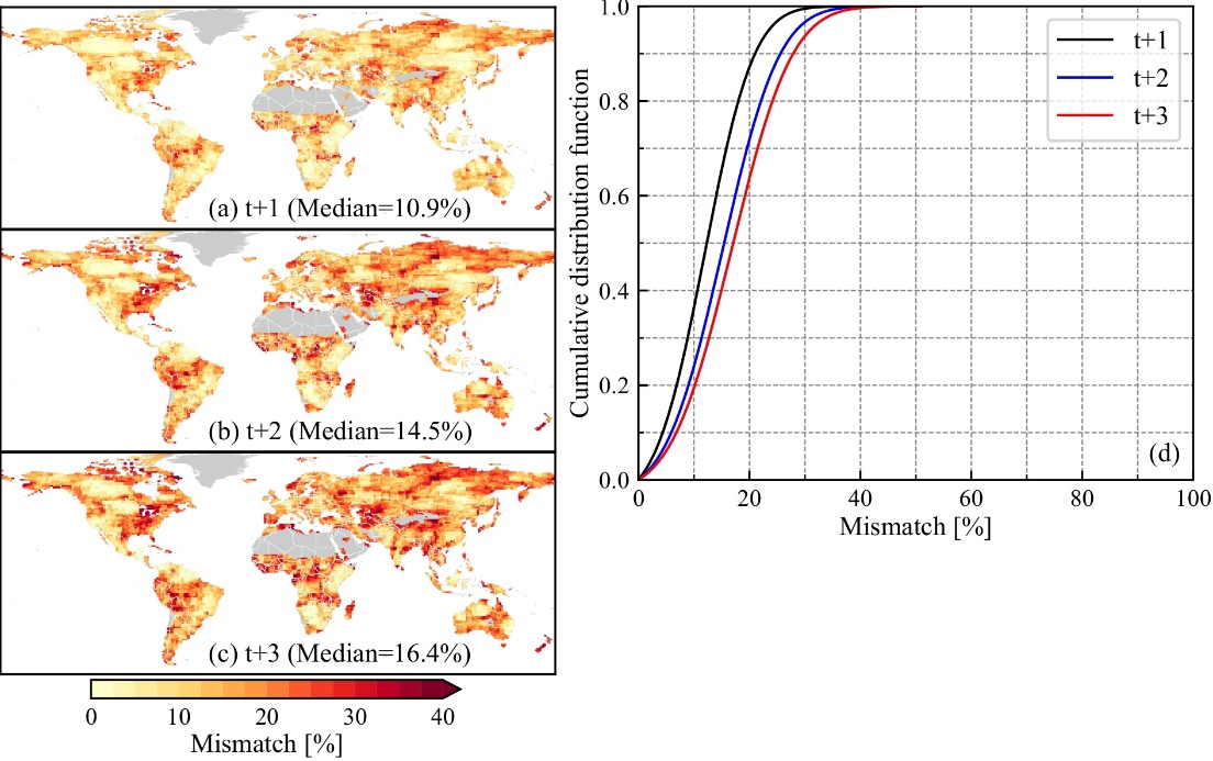 图 2BCNN模型对GRACE/FO卫星3个月数据滞后期全球水文干旱的刻画偏差