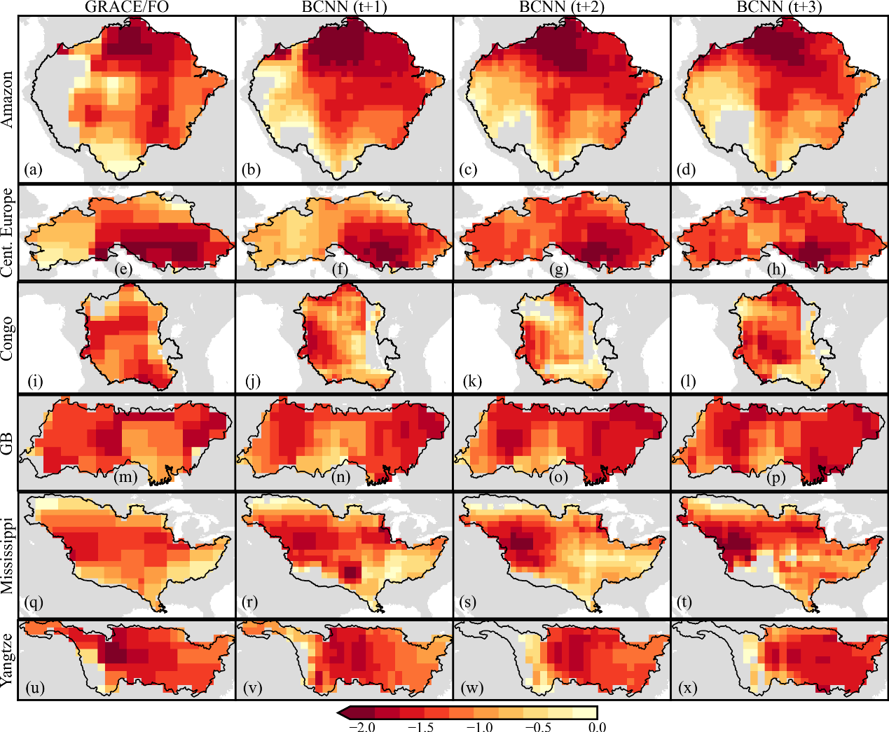 图 3BCNN对典型水文干旱事件的早期预警性能评估:(a-d)亚马逊河流域,2023年12月;(e-h)中欧地区,2022年8月;(i-l)刚果河流域,2022年2月;(m-p)恒河—雅鲁藏布江流域,2021年4月;(q-t)密西西比河流域,2022年11月;(u-x)长江流域,2022年11月
