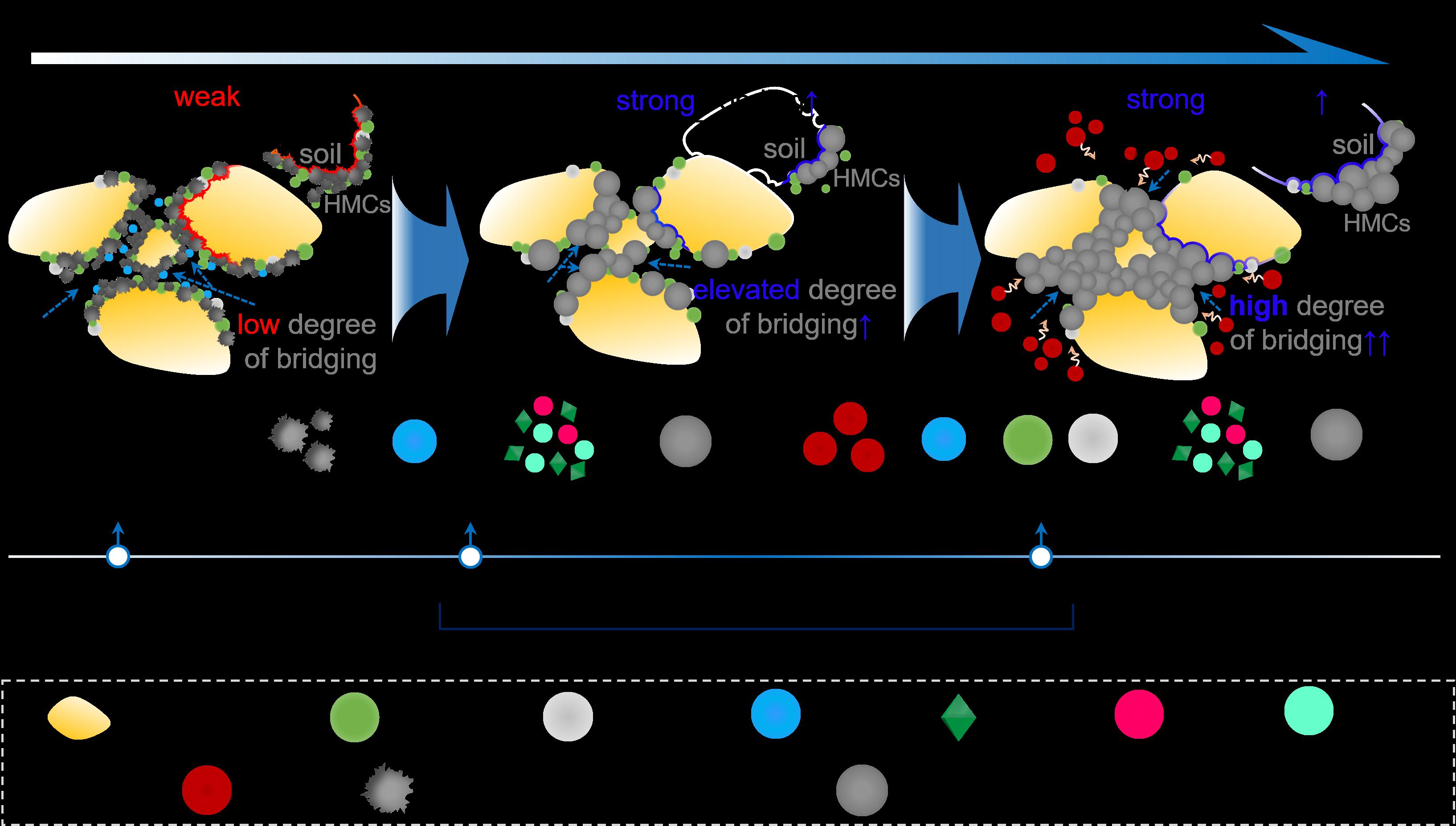 低结晶度水合碳酸镁通过溶解–重结晶–自组装形成玫瑰花簇状晶体,增强晶体间及晶体与土颗粒间胶结;残余氧化镁与氢氧化镁在干燥阶段与空气CO2反应,进一步提高土体密实度与固化效果。这种晶体重组与碳捕捉的协同增效构成了地表土体气候韧性提升的核心机制(图4)。