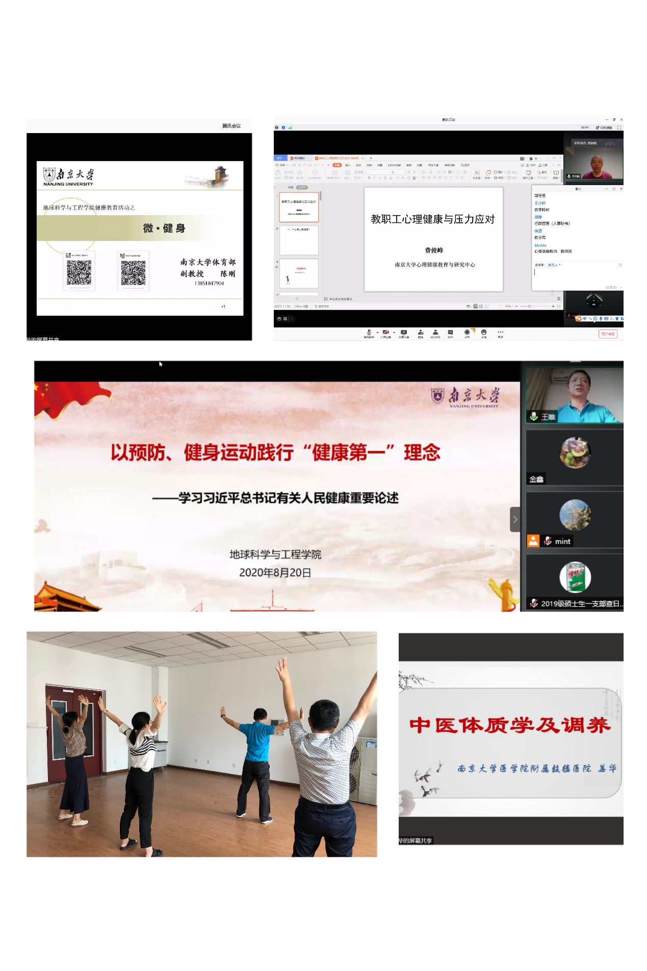为践行习近平总书记“健康第一”的教育理念,关爱师生员工的身心健康,提高全院师生健康意识,学会科学健身方法,保持身心愉悦、积极向上的健康心态;为加强“双一流”建设,实现“第一个南大”奠定健康基础,永利304官网唯一党建和业务培训中心、分工会共同举办地科院健康教育培训系列活动。本次活动于8月20日-28日期间开展,分别由院党委书记王唯讲授微党课并开设武术站桩和健身气功八段锦培训,邀请校体育部陈刚副主任作题为《“微”健身》、校心理中心费俊峰主任作题为《高校教职工心理健康和压力应对》、永利304官网唯一医学院附属鼓楼医院中医内科姜华主任医师作题为《中医体质学及调养》的三场专题讲座,从运动健身、心理健康、身体调养等方面为学院师生打造一套全方位健康培训课程。
