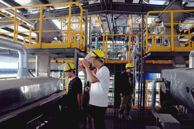 下午3点,同学们抵达了位于浦口区矿物碳封存示范工厂。朱辰老师向他们介绍了工厂的基本情况和运作流程,并且让大家带上专门的安全装备,进入生产区域近距离观察各个化工设备。同学们亲眼目睹了从烟囱排放出的二氧化碳如何被捕获,并通过一系列化学反应转化成稳定的矿物质。这一过程不仅展示了科技的力量,也让学生们深刻感受到了科技创新在应对环境挑战中的关键作用。朱老师强调:“为使矿物碳封存成为一种有效的二氧化碳减排技术,我们在烟气收集、浸取、干燥等各个步骤都做了优化,尽力做到全生命周期排放量最小,减排量最高。”