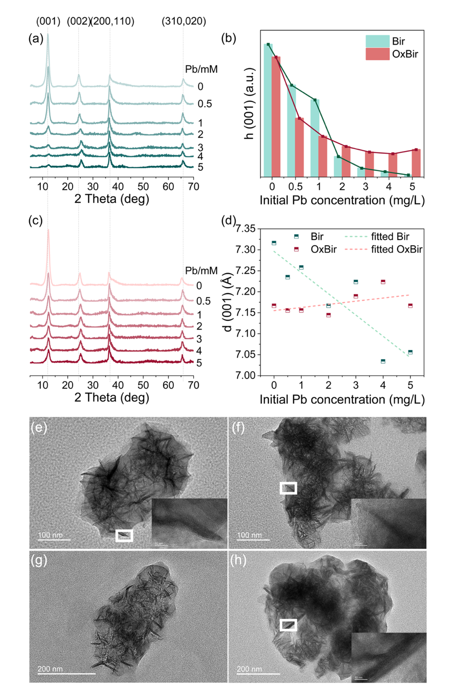 图4 Pb(II)吸附前后水钠锰矿的XRD和TEM表征结果