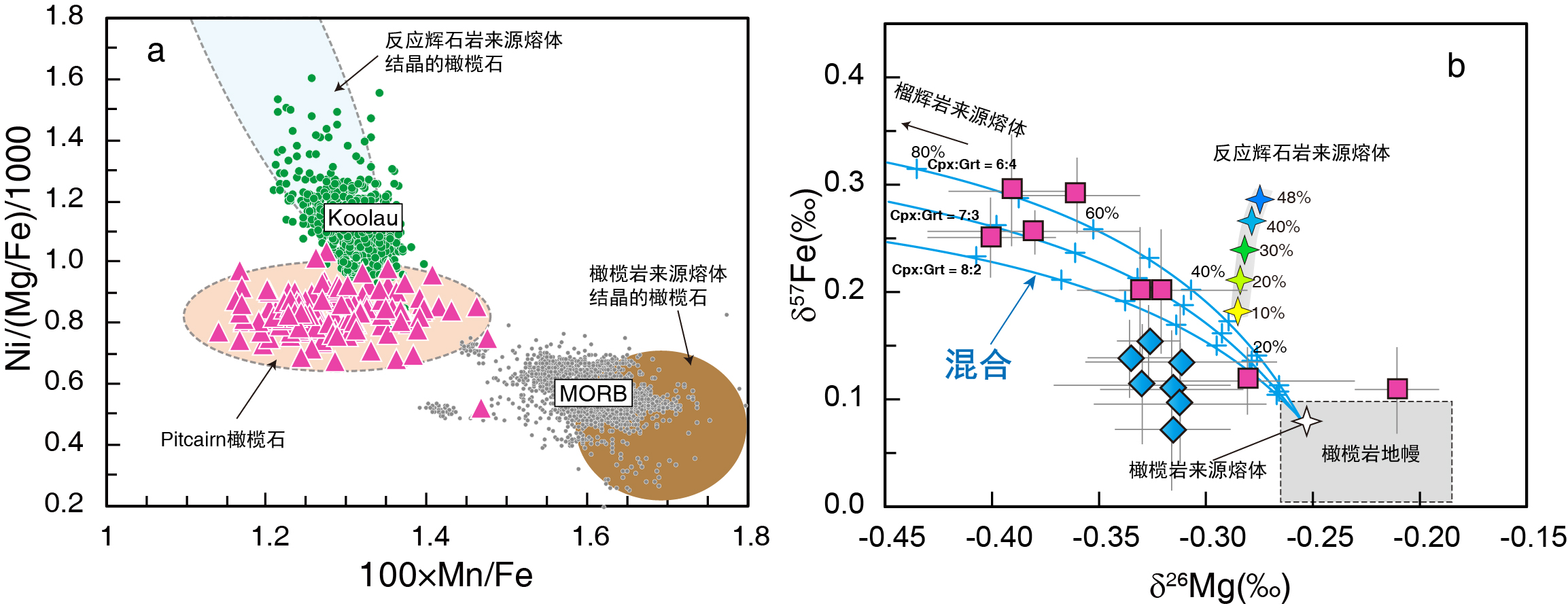 2(a) Pitcairn玄武岩中橄榄石斑晶与夏威夷Koolau玄武岩中橄榄石斑晶成分对比;(b) Pitcairn玄武岩Mg–Fe同位素组成变化