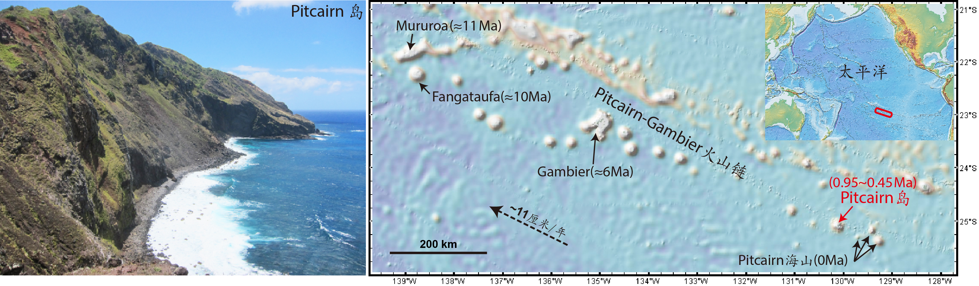 地球深部的物质组成,及伴随的地壳物质在地球内部的循环(地内循环)过程一直是国际地学的研究前沿。前人研究普遍认为,大洋板块俯冲可将洋壳和沉积物运输至深部地幔,从而造就洋岛玄武岩地幔源区(地幔柱)的化学和岩性不均一。实验岩石学研究发现,不同地幔岩性(如橄榄岩、辉石岩、角闪石岩等)部分熔融可以形成具有相似主量元素特征的玄武质熔体,这极大的增加了我们揭示深部物质岩性的难度。同时,地壳物质循环到地球内部后,还可能形成榴辉岩、反应辉石岩等多种岩性,这些岩性组成在放射性成因同位素上存在相似性,传统的地球化学手段难以精准识别。为解决上述科学难题,曾罡副教授选择了南太平洋Pitcairn洋岛玄武岩(图1)为突破口,以橄榄石斑晶的元素组成和玄武岩的Fe同位素为示踪手段,深入揭示了玄武岩的地幔源区岩性与物质组成。