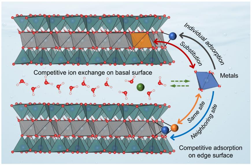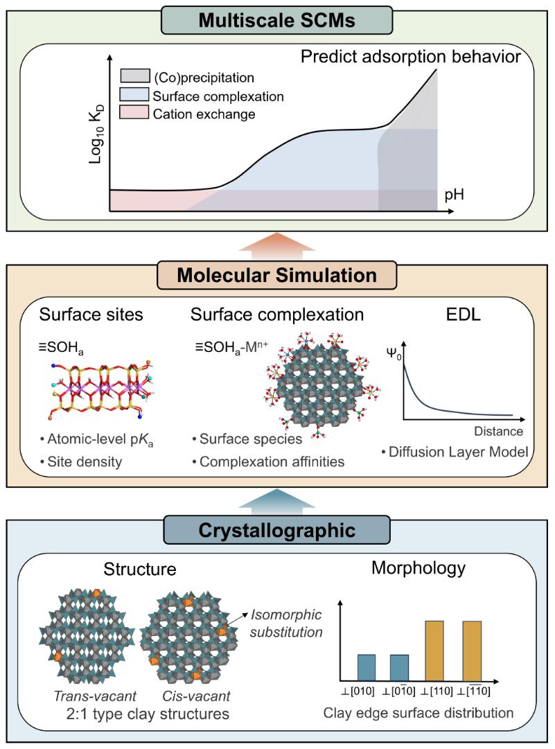 以蒙脱石为代表的2:1型黏土矿物是地球表层最为丰富的矿物类型,因其比表面积高、层间阳离子交换容量大、表面活性强而成为控制金属元素地球化学循环和重金属环境归趋的关键矿物。精准预测多种金属在黏土矿物表面的竞争吸附行为是揭示金属元素地球化学行为和研发重金属污染修复材料的关键科学问题。传统的表面络合模型(Surface Complexation Model, SCM)源自经验假设与实验数据拟合,缺乏界面反应机制的理论支撑,导致该模型的可移植性和拓展性差,虽能描述单一金属的吸附行为,但对多种金属竞争吸附尚不能准确预测。