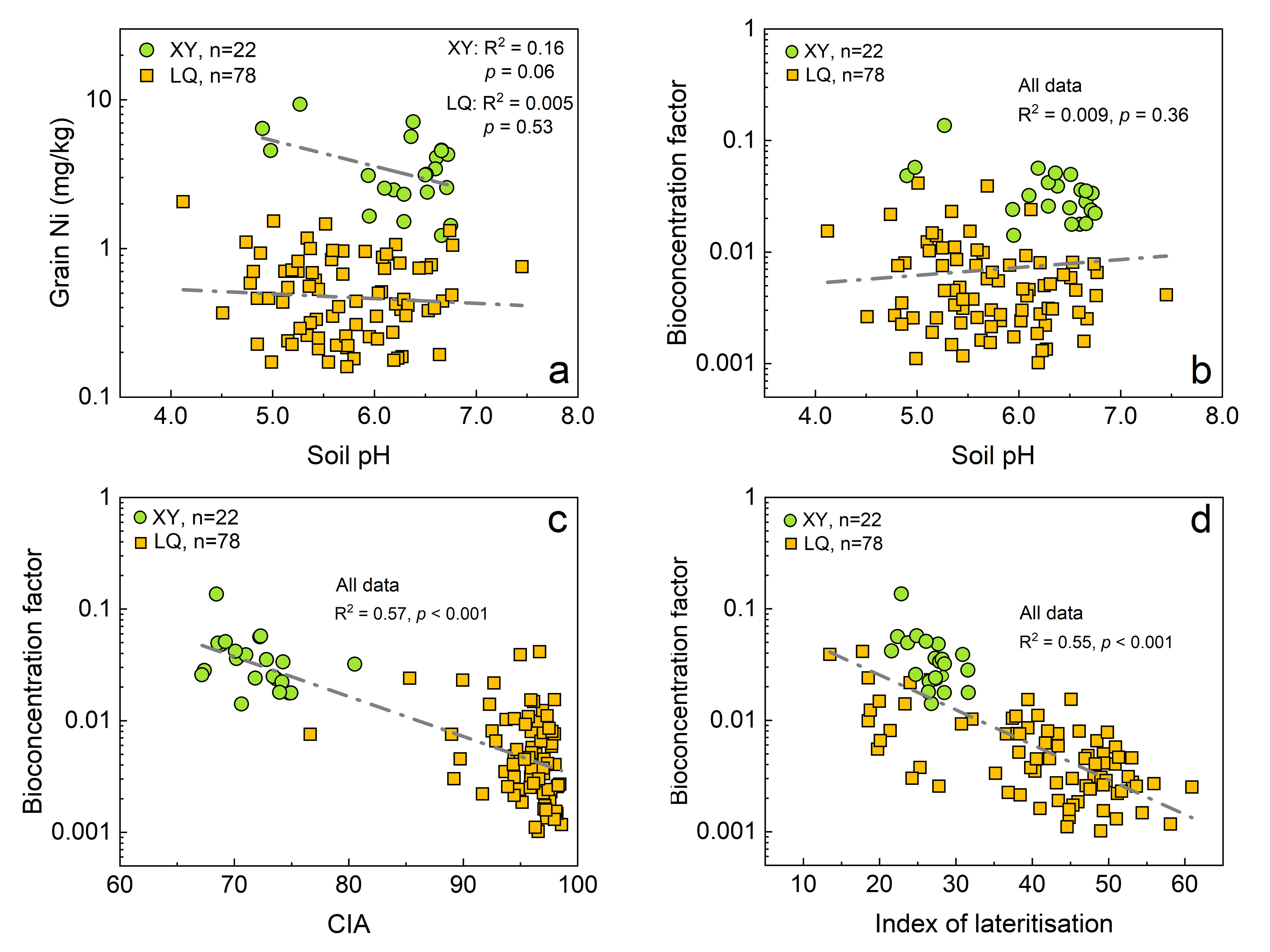 图3 研究区水稻籽实中镍的累积对土壤pH(a和b)和化学风化强度(c和d)的响应