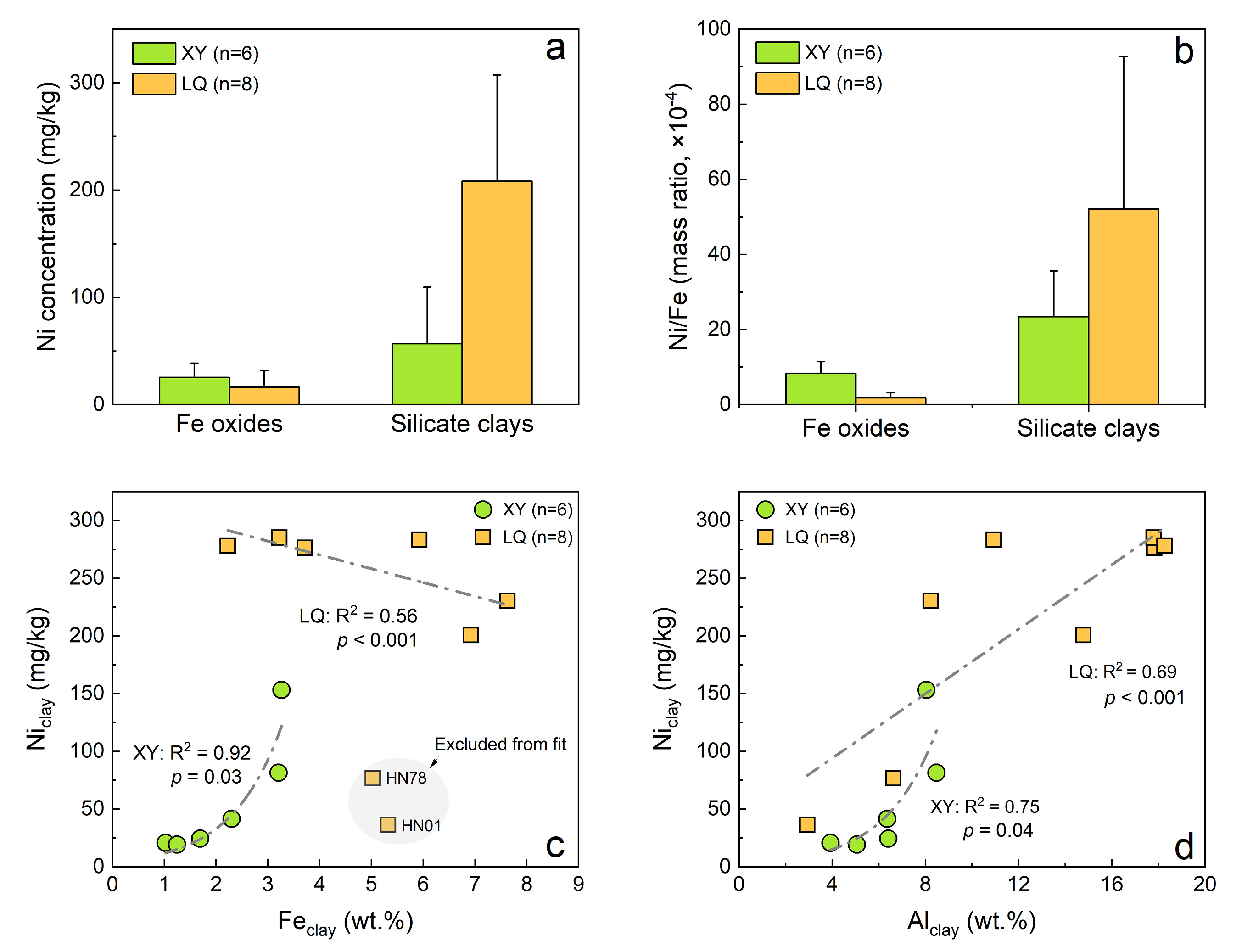 图2 研究区稻田表土中镍元素在铁氧化物和硅酸盐粘土矿物之间的配分