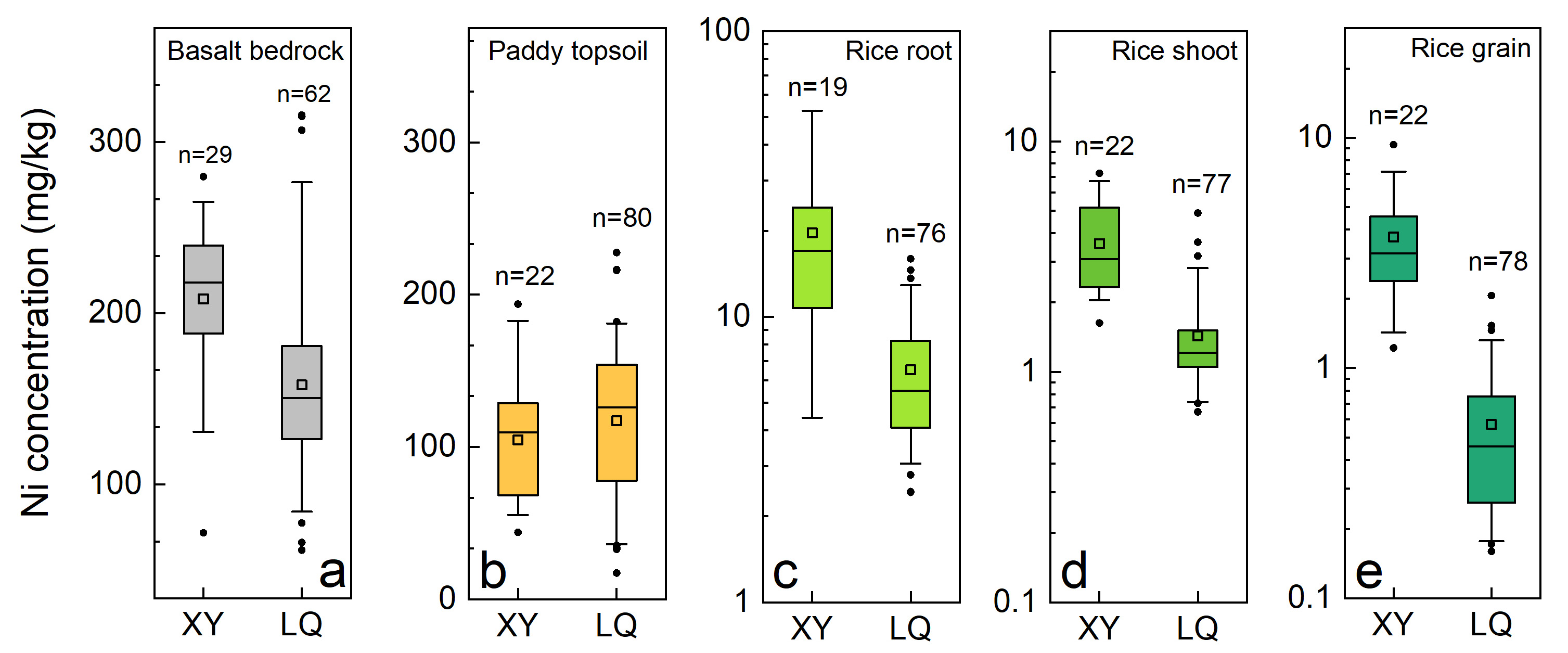 图1 江苏盱眙(XY)和雷琼地区(LQ)玄武岩风化发育形成的稻田系统中镍元素的含量分布