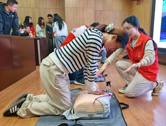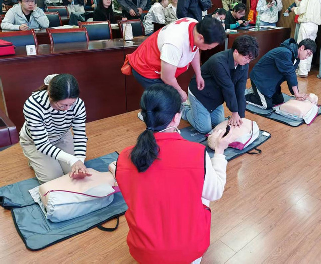 培训设置理论与实操双重考核机制。理论测试覆盖急救原则、设备操作要点及并发症预防等内容;实操考核则要求学员在模拟场景中独立完成CPR+AED联合施救,并规范处理模拟创伤案例。通过考核的师生获南京市红十字会颁发的急救技能认证证书。