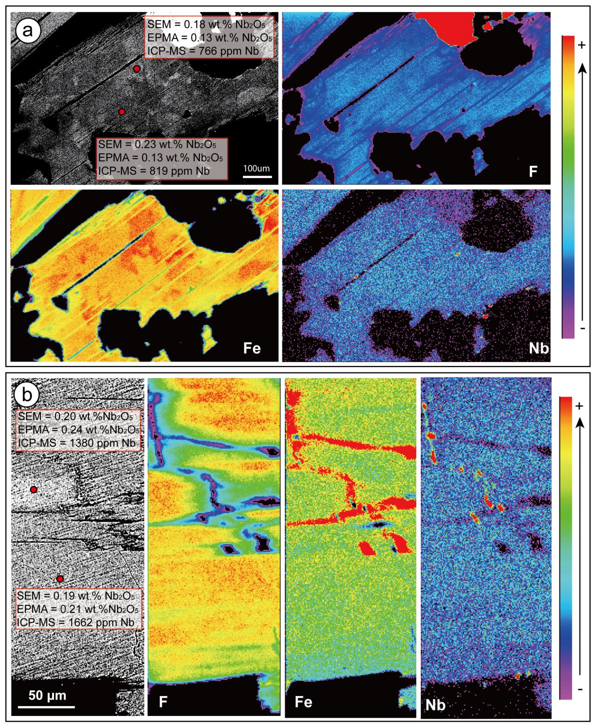 王汝成教授团队对黄山岩体全岩地球化学分析后,发现黄山岩体全岩Nb含量平均约为144 ppm 和 158 ppm, 与世界著名稀有金属花岗岩例如江西宜春花岗岩(90 ppm)和法国Beauvior花岗岩(~150 ppm)相似。黄山岩体Nb储量经估算约为80 kt, 该储量与世界著名的澳洲Kanyika矿床(121 kt)相当。通过详细的岩相学和矿物学观察,结合电子探针,扫描电镜以及LA-ICP-MS等分析手段,发现黄山岩体中无大量铌钽氧化物产出,Nb元素均匀富集于云母中(图1)。其中铁云母Nb含量平均为1347 ppm,黑鳞云母Nb平均含量为884 ppm,是目前为止文献中报道的Nb含量最高的云母(图1-2)。黄山中粒花岗岩中大量副矿物包括锆石、富铱萤石、富钍氟铈矿的出现,表明初始岩浆为过碱质岩浆。云母中大量Nb富集表明岩浆中Nb元素的高度溶解,同时也可能与岩浆温度较高有关(全岩锆Zr饱和温度计估算为790-800℃)。这一研究表明黄山花岗岩是一个新型的富Nb花岗岩,具有潜在开采价值;而云母作为Nb的载体,是一种新型的富Nb矿物,可作为稀有金属矿化的标志性矿物,开辟了找矿新方向。