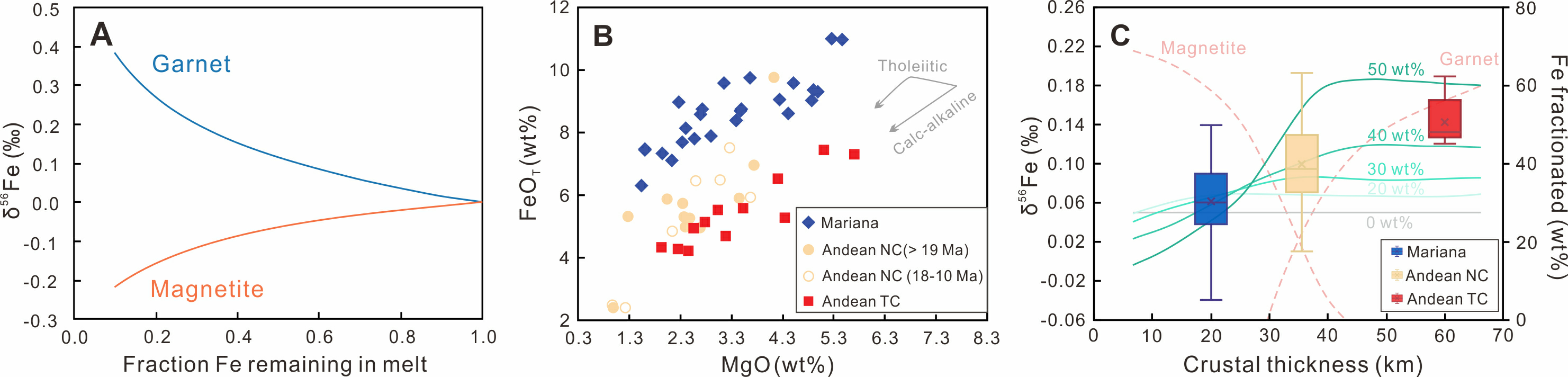 图1 (A)石榴子石(Garnet)和磁铁矿(Magnetite)分离对岩浆δ56Fe值的影响。(B)薄地壳(Mariana)、正常地壳(Andean NC)和加厚地壳(Andean TC)铁亏损程度对比。(C)不同地壳厚条件下弧岩浆的δ56Fe值对比。实线表示计算的不同结晶程度岩浆的δ56Fe值,虚线代表50 wt%结晶程度时,堆晶中石榴子石和磁铁矿含铁量的占比。