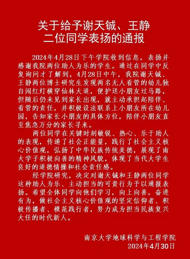 关于给与谢天铖、王静二位同学表扬的通报