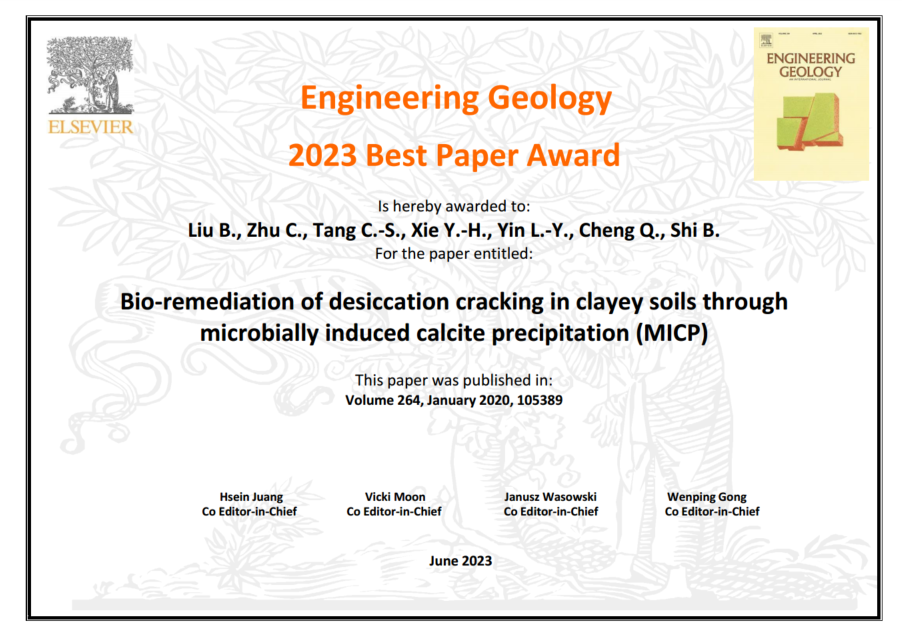 永利官网唐朝生教授课题组发表的关于微生物技术抑制土体龟裂研究论文被工程地质领域的顶级期刊Engineering Geology授予2023年度最优论文奖(https://www.sciencedirect.com/journal/engineering-geology/about/news)。论文的第一作者为唐朝生教授指导的博士研究生刘博。