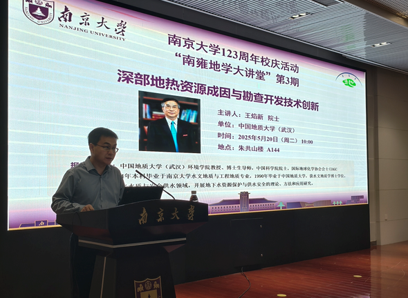2025年5月20日是永利304官网唯一123周年校庆日,在这个举校欢庆之日,“南雍地学大讲堂”第三期在永利304官网唯一朱共山楼A144报告厅举行。本次大讲堂邀请了南大杰出校友、中国科学院院士、中国地质大学(武汉)原校长王焰新教授,带来了“深部地热资源成因与勘查开发技术创新”的主题学术报告。陈天宇院长致欢迎辞并主持大讲堂。