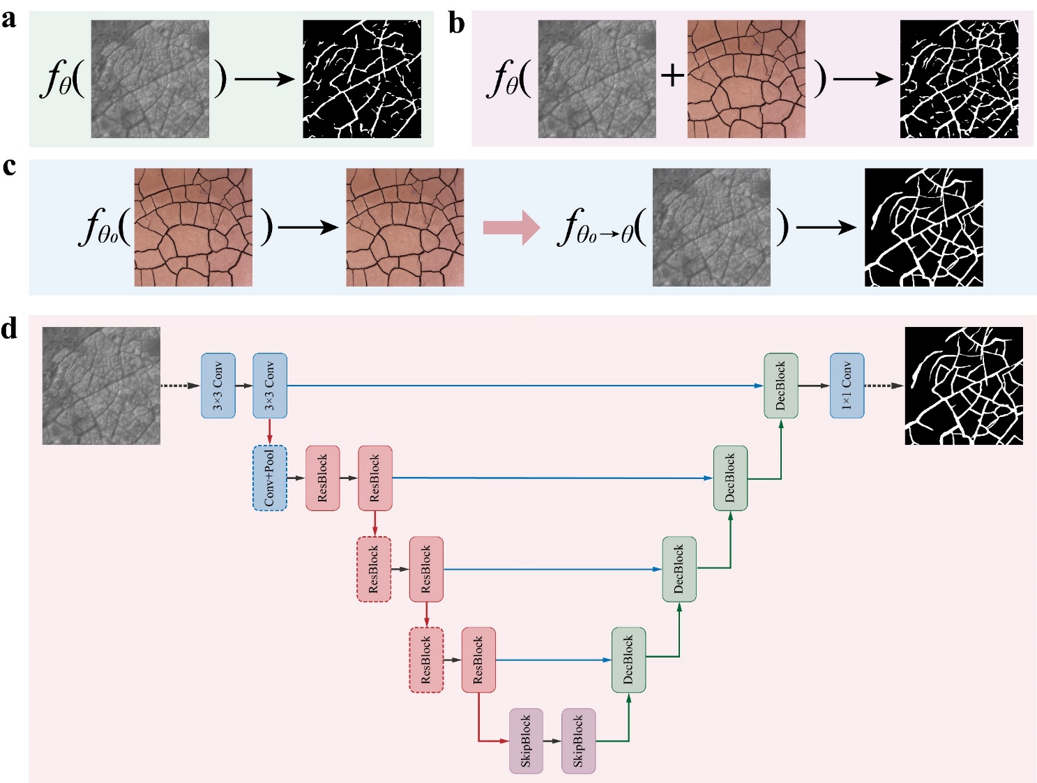 针对这一关键科学挑战,唐朝生教授团队自主研发了名为“Mars-CrackNet”的深度学习模型(图1)。为应对火星表面高分辨率标注图像极度匮乏的难题,团队创新性地引入了半监督学习框架。通过引入大量未标注的地球多尺度土体龟裂(EDCs)图像进行预训练,再利用少量标注的火星裂隙图像进行微调,该模型成功克服了跨行星数据域的差异,实现了对低分辨率火星图像中复杂裂隙网络的高效、精准提取。