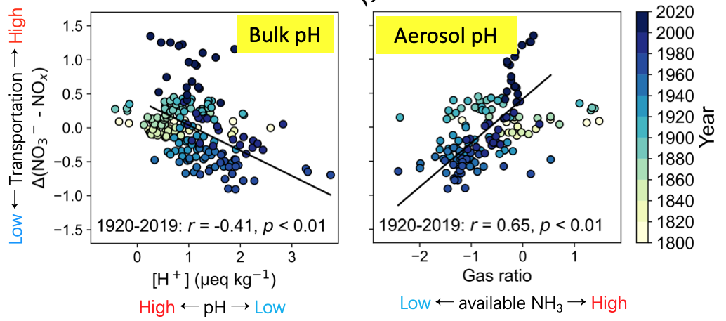 基于GEOS-Chem模型的历史模拟实验显示,随着人类活动演变,大气酸度及其对硝酸的气-粒分配比例发生变化,进而影响硝酸在大气中的寿命及其传输效率。特别是自1970年代以来,大气中和作用增强(酸度降低),HNO3转化为NO3⁻的比例上升,使硝酸更容易以颗粒形式远距离输送,解释了NO3⁻浓度下降幅度低于NOX排放减少幅度的原因(图3)。