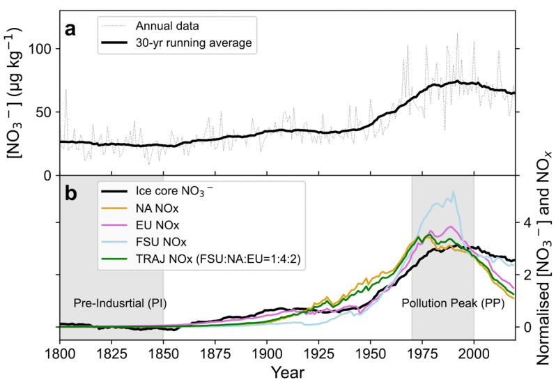 图1a显示了1800–2020年期间冰芯中NO3⁻浓度(黑线)的变化。整体趋势虽与NOX排放变化一致,但在1920–1970年间NO₃⁻浓度上升速度低于NOX排放增长;而1990年代以后,尽管NOX排放急剧减少,但NO3⁻浓度下降却相对缓慢。这说明两者间存在明显时间滞后。