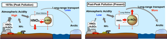 针对上述科学问题,研究团队利用格陵兰冰盖的冰芯样本,成功高精度重建了从工业革命至今的大气硝酸(NO3⁻)历史变化。研究发现,大气中硝酸浓度的增加与后期的下降并非仅由人为氮氧化物(NOX)排放量驱动,而是受控于随大气酸度变化所导致的气-粒分配过程。这一结果强调了大气酸度在控制硝酸长距离输送至北极过程中的核心作用。