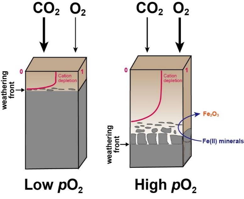 地质历史时期碳循环的扰动深刻影响着全球气候,其中大陆硅酸盐风化被认为是调节长时间尺度下碳循环和全球气候的重要因素,即“地质空调”。经典观点认为构造隆升驱动下的化学风化增强是造成地质历史时期全球气候变冷的最重要因素之一,如中晚新生代全球变冷 (Raymo and Ruddiman, 1992 Nature)、晚古生代大冰期 (Goddéris et al., 2017 Nature Geoscience)等,此外,大规模基性岩出露及风化也是引发全球变冷甚至冰期的出现的重要因素,如新元古代“雪球地球”事件 (Cox et al., 2016 EPSL; Pu et al., 2022 Science Advances)。然而作为地球大气另一重要组成部分的氧气,在地质历史时期其浓度变化对于地球气候的影响一直以来得到的关注度很低,近年来岩石有机碳和黄铁矿的氧化风化被认为是大气二氧化碳的一个重要来源,但是大气氧浓度对于硅酸盐岩石化学风化的影响却鲜有研究,地质历史时期大气阶段性增氧过程中大陆化学风化的综合响应目前还存在诸多不确定性。作者从现代风化剖面风化前锋带(即风化深度)研究入手,比较氧气浓度对于玄武岩和花岗岩风化前锋带的影响程度,认为当其它构造和气候条件(如剥蚀速率、温度、降水等)保持不变的情况下,氧气浓度的增加可以氧化岩石中黑云母等含铁矿物,造成风化剖面孔隙度增大,最终导致花岗岩风化前锋带下移(即风化深度增加)和风化效率增加。