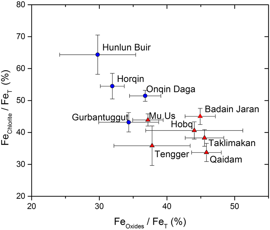 表生地球化学研究团队针对我国北方沙漠的地表沉积物样品,联合地球化学连续提取、漫反射光谱、X射线衍射等方法,着重研究了能够长距离传输粘土粒级(< 2 µm)中的含铁矿物及其地球化学形态,获得主要认识有(1)中国主要沙漠表层沉积物粘粒中含铁矿物和铁形态西部沙漠和东部沙地存在明显空间分布差异,西部沙漠铁矿物和铁形态分布特征可能和青藏高原隆升存在联系;(2)塔克拉玛干沙漠中易还原铁氧化物含量高于其它沙漠,这种现象可能与盆地周围山脉剥蚀/风化所致通过高山作用输送至塔克拉玛干沙漠;(3)沙漠沉积物粘土粒级中潜在输送给太平洋的主要含铁矿物是针铁矿和绿泥石;(4)研究提供了东亚主要尘源区的含铁矿物及化学形态的数据,可能有效提高全球粉尘铁模型的基础数据之一。