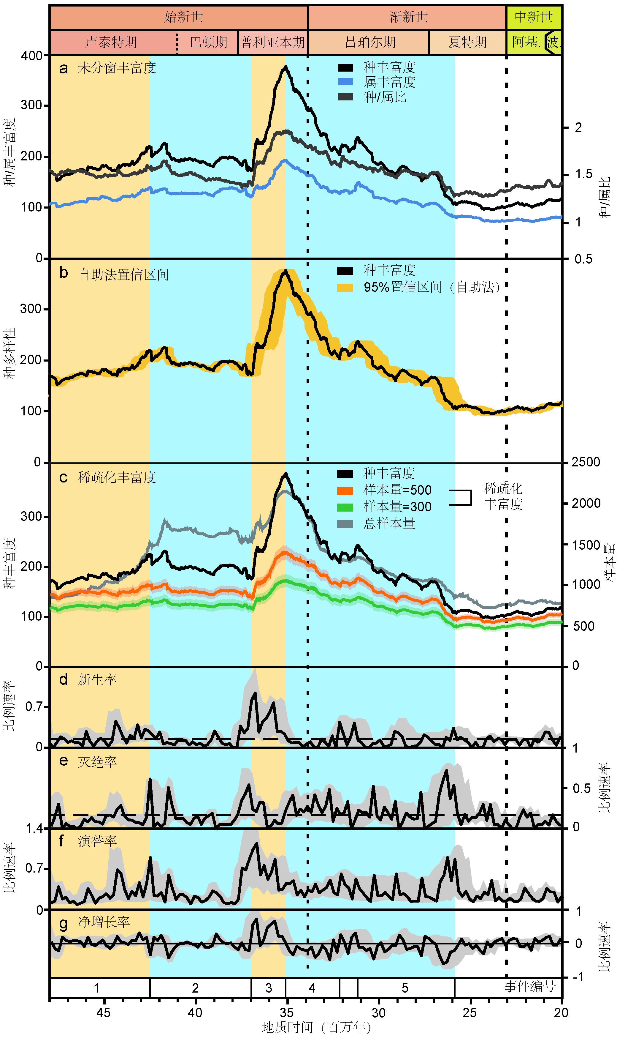 图2. 全球有孔虫物种丰富度总多样性及相关演化速率变化。