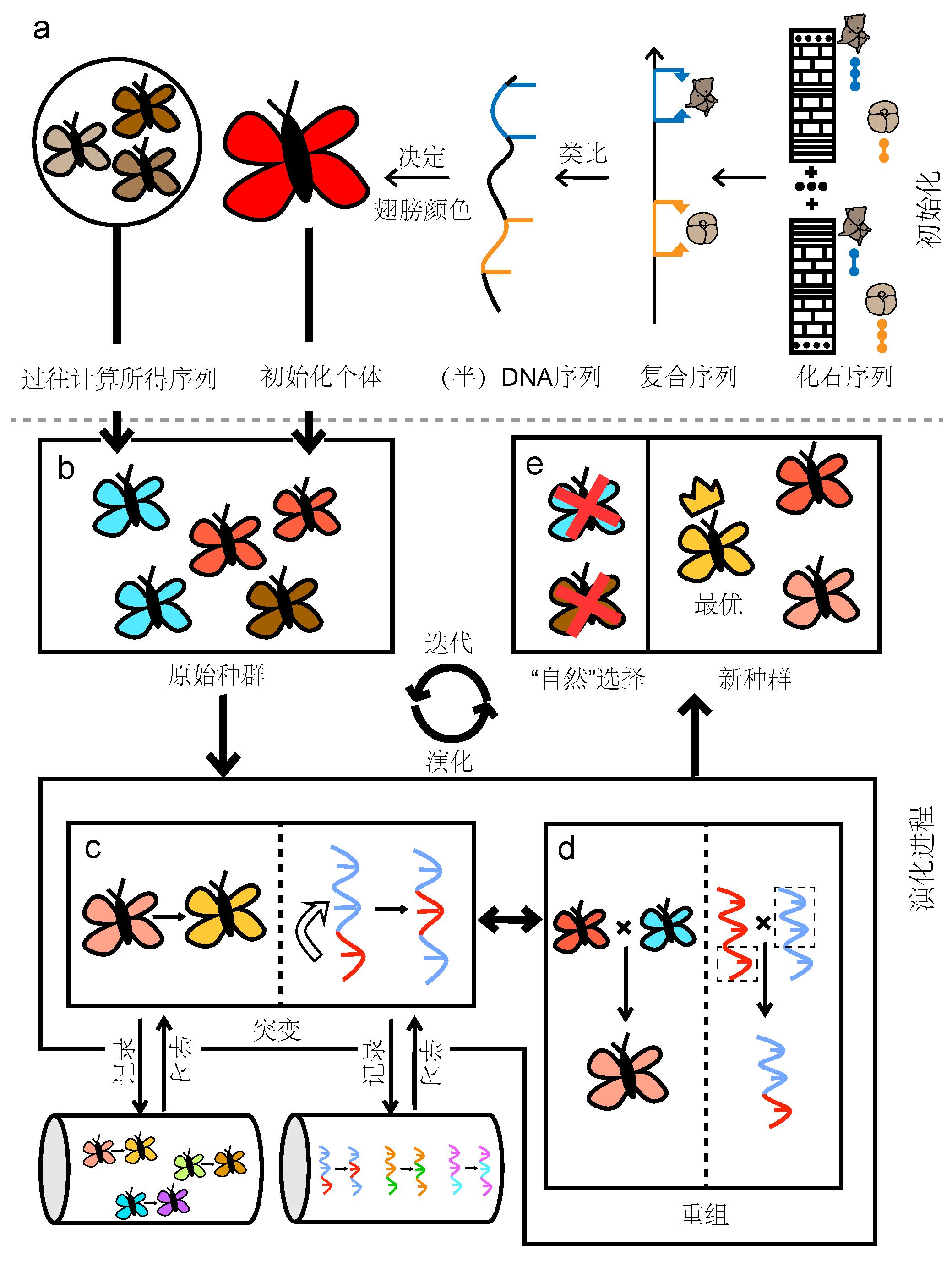 图1. CONOP.EA算法流程示意图。该算法首先通过初始化生成一批地层对比结果的初始解,将其模拟为生物的DNA序列;随后对这些DNA序列不断进行突变(对单个序列进行小幅调整)和重组(随机选择两个序列进行交叉,实现大幅调整),生成新的DNA序列;接着通过自然选择的“优胜劣汰”过程,保留相对更优的序列,淘汰排名靠后的序列;经过反复迭代,最终获得一个最优的DNA序列,即涵盖所有剖面和钻井化石记录的最优地层对比结果。