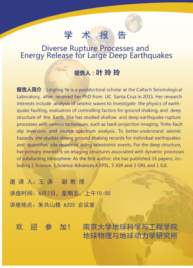 2017-6-2 叶玲玲博士报告:Diverse Rupture Processes and Energy Release for Large Deep Earthquakes