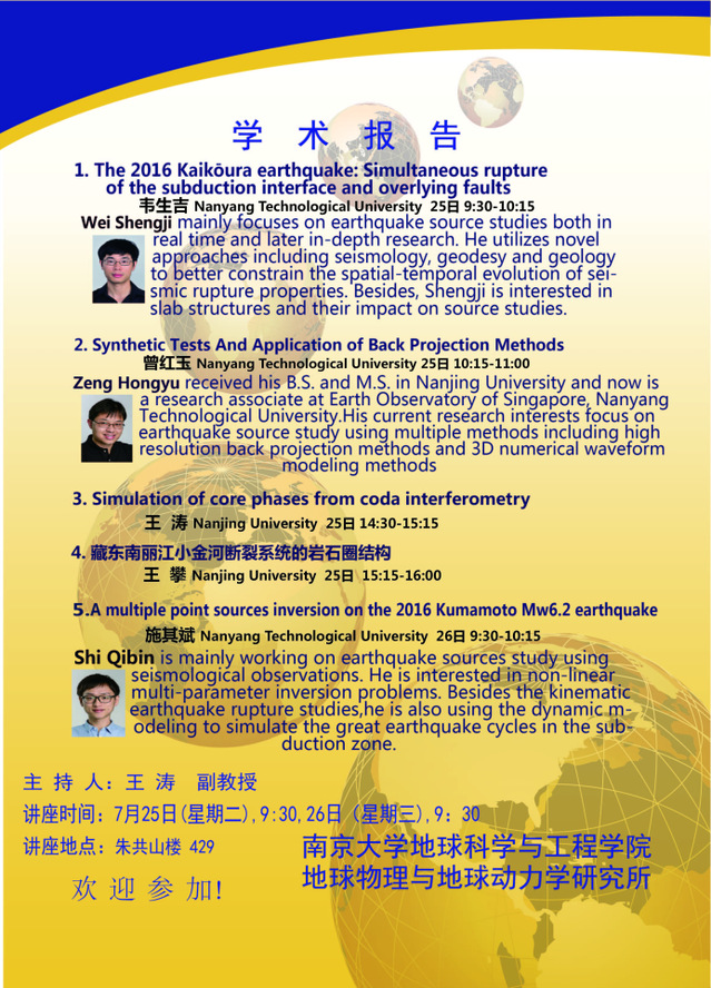 欢迎各位老师、同学参加7月25日、26日关于震源及破裂过程、地核震相尾波干涉提取及岩 石圈结构的研究报告,