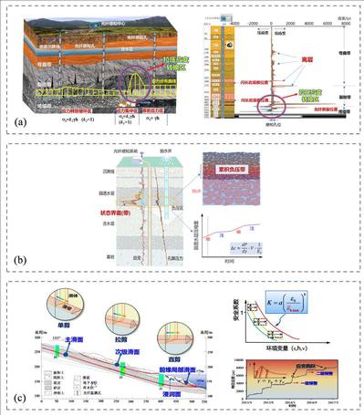 长期的工程地质实践表明,岩土体的灾变与岩土体内部存在的各种力学不连续界面的分布与演化密切相关。作者根据不连续界面的变化特点,将岩土体中的界面归纳为三类,即物质界面,状态界面和运动界面(图1)。物质界面是岩土体灾变的基础,状态界面是岩土体灾变的诱因,运动界面是岩土体灾变的后果。三类界面是岩土体灾变的锁钥,它们的共同的特征是高隐蔽性和强不确定性。因此,提高岩土体原位观测技术水平是灾害风险评价与预测预警的关键。