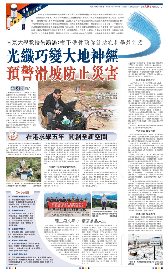 2005年,朱鸿鹄进入香港理工大学土木及结构工程系攻读博士学位,师从土力学学科带头人殷建华教授。当时殷教授了解到国际上正在探索研发一种光纤传感技术,能够在线监测被测物的形变和温度等物理指标,尤其适用于长距离和大范围的工程监测。彼时国际上光纤传感应用最多的领域是结构工程和航空航天工程。朱鸿鹄说,“香港青马大桥率先建立了一个光纤监测系统,一举成为国际结构健康监测史上的经典案例。”“而光纤监测应用于滑坡防治,既有很大的发展潜力,也面临巨大的挑战。”